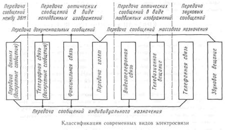 Всякий раз, коли встаi питання про передачу повiдомлень на вiдстань, принципове значення мають вигляд i характер передаваних повiдомлень. Рiч у тому, що для передачi повiдомлень рiзного вигляду i характеру необхiднi вiдповiднi системи електрозв'язку. Наприклад, пристроi для перетворення оптичних повiдомлень в сигнал i назад не можуть бути використанi для перетворення звукових повiдомлень i т.д. Сигнали, отриманi в процесi перетворення, також вiдрiзняються по своiх параметрах i характерi. Тому для передачi рiзних сигналiв вимагаiться рiзнi канали. Але справа не тiльки у властивостях повiдомлень. Пристрiй i принцип роботи елементiв систем електрозв'язку залежать також вiд призначення передаваних повiдомлень i вимог, що пред'являються до якостi передачi. Всi цi обставини привели до створення декiлькох видiв електрозв'язку, реалiзованих вiдповiдними технiчними системами. Державним стандартом визначенi наступнi масовi види електрозв'язку: телефонний зв'язок, телеграфний зв'язок, зв'язок факсимiле, зв'язок вiдеотелефону, звукове вiщання, телевiзiйне вiщання, передача газет, передача даних.