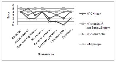 Анализируя данные таблицы 2 и рисунка 1 можно сделать следующие выводы: наиболее сильным предприятием является ВлПсковский хлебокомбинатВ» он получил наиболее высокую балльную оценку конкурентных преимуществ. Наиболее слабый конкурент - ВлФермерВ», наше предприятие занимает почетное 3 место, что говорит о его относительной устойчивости по отношению к конкурентам.