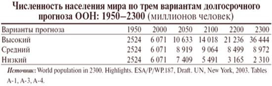 Если реализуется ВлвысокийВ» вариант прогноза ООН, демографический взрыв так и не прекратится, население Земли к концу XXI века превысит 14 миллиардов человек и будет продолжать расти. По ВлсреднемуВ» варианту к середине XXI века демографический взрыв в мировых масштабах в основном завершится, к 2075 году численность населения планеты достигнет максимума в 9,2 миллиарда человек и затем практически стабилизируется на этом уровне. По ВлнизкомуВ» варианту уже после 2040 года население мира, едва преодолев планку в 7,5 миллиарда человек, начнет сокращаться тАФ до 5,5 миллиарда в конце XXI века, до 3,2 миллиарда в конце XXII и до 2,3 миллиарда человек в конце XXIII века (см. табл. 1).
