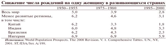 Развитие событий по такому сценарию не только желательно, но и весьма вероятно. Западные общества создали и социальные механизмы, побуждающие к низкой рождаемости, и технические средства, позволяющие реализовать эту политику. Постепенно этот опыт перенимается всеми странами мира. Рождаемость повсюду снижается, пусть и не так быстро, как хотелось бы, а к числу государств с рождаемостью ниже уровня простого воспроизводства сейчас относятся уже не одни лишь высоко индустриализованные страны, но и все еще крестьянский по преимуществу Китай тАФ самая многолюдная держава планеты; в этом же направлении движутся многие страны третьего мира, хотя есть и такие, особенно в Африке, где рождаемость все еще остается очень высокой (см. табл. 2).