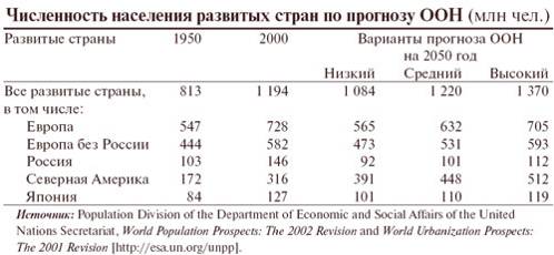 Во всех странах ВлСеверного кольцаВ» установился демографический режим, подводящий их к границе депопуляции или уже сейчас делающий эту депопуляцию реальностью. Никакой перспективы сколько-нибудь значительного роста численности населения этих стран за счет внутренних источников нет. Согласно всем прогнозам, даже при самом оптимистическом варианте оно может лишь незначительно увеличиться тАФ за счет США и Канады. Россия тАФ часть развитого ВлСевераВ», и население России, так же как и население всей Европы, обречено на сокращение (см. табл. 3).