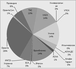 Графiк 1. Кiлькiсть договорiв по страхових компанiях, у% вiд загальноi кiлькостi