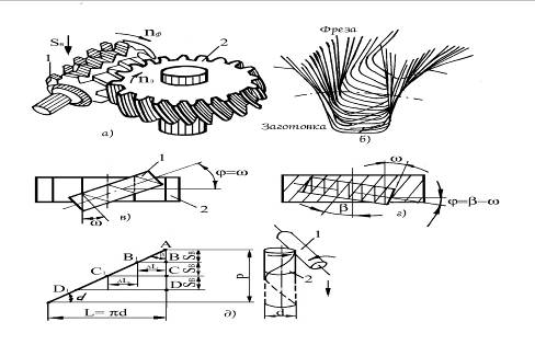 При фрезеровании цилиндрических косозубых колес с углом наклона зуба β (рис.1,г) ось фрезы устанавливают под углом φ=βВ±ω (со знаком ВлплюсВ» - в случае разноименных направлений винтовых канавок на фрезе и заготовке, со знаком ВлминусВ» - при одноименных).