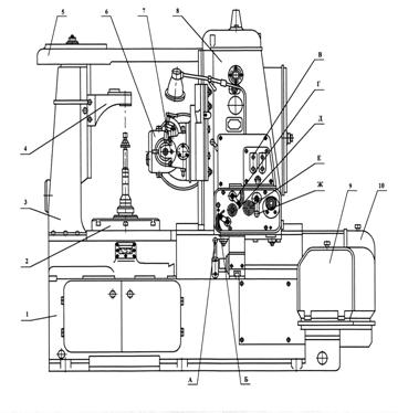 1тАУстанина; 2тАУстол; 3тАУстойка; 4тАУподдерживающий кронштейн; 5тАУпоперечина; 6тАУфрезерный суппорт; 7тАУпротяжной суппорт; 8тАУподвижная стойка; 9тАУгитары дифференциала и подач; 10тАУгитара деления и обкатки.