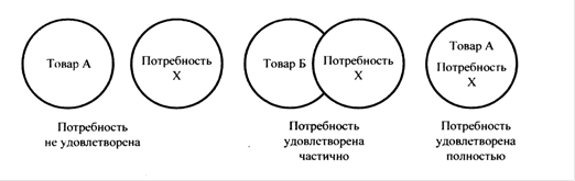 Можно изобразить конкретный товар и конкретную человеческую потребность в виде кругов, а потребительскую ценность товара в виде степени их совмещения. На рис.1 показано, что товар А не удовлетворяет потребность X, товар Б удовлетворяет ее частично, а товар В - полностью. В этом случае у товара самая большая потребительская ценность, т.е. высокая потребительская лояльность.