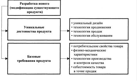 Разработка инновационной стратегии предполагает планово-управленческие решения по изготовлению подлинных товаров-новинок для удовлетворения потребительских нужд. Для завоевания устойчивого конкурентного преимущества процесс разработки товара, его продвижения и продажи должен включать два блока - базовый набор свойств и уникальные достоинства продукта (Рис.3)