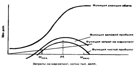 Для определения оптимального уровня маркетинговых затрат управляющий по маркетингу удаляет из функции реакции сбыта все немаркетинговые издержки и получает в результате функцию валовой прибыли. Затем функцию маркетинговых затрат представляют в виде прямой, которая начинается на нулевой отметке и идет наклонно вверх в соотношении 1 долл. маркетинговых затрат по горизонтали на каждые 10 долл. по вертикали. После этого получают функцию прибыли-нетто, вычитая функцию маркетинговых затрат из функции валовой прибыли. Функция прибыли-нетто говорит о положительной чистой прибыли при уровне маркетинговых затрат между Мнизк и Мвыс. Это и есть рациональный диапазон затрат на маркетинг. Функция чистой прибыли достигает своего максимума в точке М. Следовательно, уровень маркетинговых затрат, обеспечивающих получение максимальной чистой прибыли, должен равняться М долл.[5]