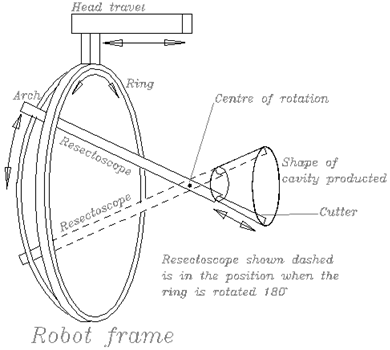 В те же девяностые годы в Имперском Колледже в Лондоне был создан робот для трансуретральной резекции гиперплазированной предстательной железы - Probot, допущенный к клиническим испытаниям в 1996 году. Он состоит из трех осей движения и четвертой оси для перемещения резектоскопа, как показано рисунке.