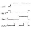 Одновибратор, выполненный по схеме, приведенной на рис. 1.4.3,а, работает следующим образом: в исходном состоянии устройства на выходе счетчика DD2 присутствует напряжение высокого уровня, запрещающее работу генератора, собранного на элементах ИЛИ-НЕ (DD1.1. DD1.2) микросхемы DD1. При импульсе высокого уровня на входе счетчик DD2 обнуляется тАФ на его выходе появляется напряжение низкого уровня, разрешающее работу генератора. После того, как счетчик отсчитает 213 импульсов, на его выходе появится напряжение высокого уровня, запрещающее работу генератора. Таким образом, по фронту импульса на входе запуска на выходе устройства формируется импульс низкого уровня длительностью в 213 импульсов задающего генератора. При этом на выходе 212 (вывод 2) счетчика формируется импульс высокого уровня вдвое меньшей длительности, заканчивающийся одновременно с основным низкого уровня, на выходе 211 (вывод 2)тАФдва импульса и т.д. рис. 1.4.3,б. Поскольку формирование выходного импульса всегда начинается из одного и того же состояния задающего генератора, то исключается случайная погрешность длительности импульса, связанная с неопределенностью фазы генератора.
