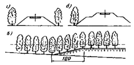 9.13. Откосы выемок в лесу следует засаживать кустарником местных пород и деревьями III категории с увеличением высоты посадок снизу вверх по откосу (рис. 4), чтобы создать как бы опушку и улучшить продуваемость выемки зимой.
