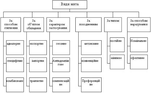Митнi тарифи класифiкують за рiзними ознаками. Так, за обтАЩiктом обкладання iх подiляють на: iмпортнi призначенi для реалiзацii на внутрiшньому ринку; експортнi, якi застосовуються, як правило, в випадку рiзницi внутрiшнiх цiн, що регулюються i цiн свiтового ринку на конкретнi товари або сировину з метою скорочення експорту i одночасного поповнення нацiонального бюджету; транзитнi встановлюються на товари, що проходять транзитом через територiю даноi держави.