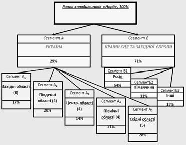 Рис. 4.3 - Сегментацiя ринку холодильникiв "Норд" за географiчною ознакою