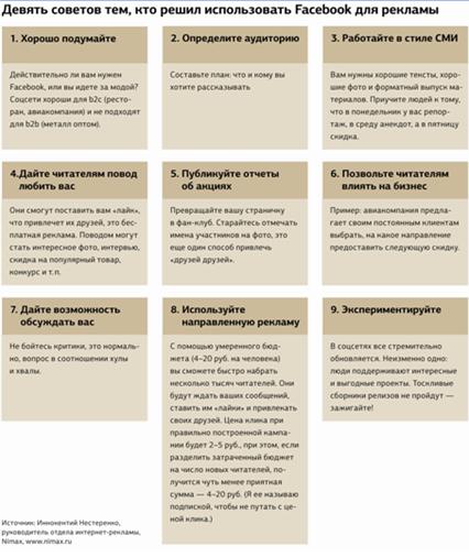 ) даёт следующие советы для тех, кто решил разместить свою рекламу в социальной сети Facebook. Уверена, что эти же советы подойдут и для других социальных сетей.