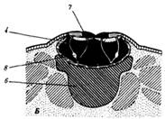 1тАФкожа, 2тАФпучок волос, 3тАФтвердая мозговая оболочка, 4тАФ субарахноидальное пространство, 5тАФспинной мозг, 6тАФтело позвонка, 7тАФоткрытая нервная пластинка, 8тАФспинной чувствительный узел