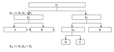 При классификации кредитов возможно использование модели CART (Classification and regression trees), что переводится как Влклассификационные и регрессионные деревьяВ». Это непараметрическая модель, основные достоинства которой заключаются в возможности широкого применения, доступности для понимания и легкости вычислений, хотя при построении применяются сложные статистические методы. В Влклассификационном деревеВ» фирмы-заемщики расположены на определенной ВлветвиВ» в зависимости от значений выбранных финансовых коэффициентов; далее идет ВлразветвлениеВ» каждой из них в зависимости от следующих коэффициентов. Точность классификации при использовании данной модели тАУ около 90%. Пример Влклассификационного дереваВ» представлен на рис. 1.2, где Кi тАФ финансовый коэффициент; Рi тАФ нормативное значение показателя; В тАФ предполагаемый банкрот; S тАФ предположительно устойчивое состояние.