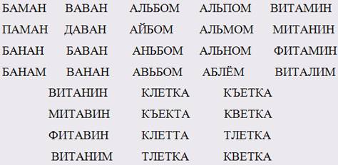 Процедура. Ребёнку предлагается повторить похожие слова вначале по два, затем по три в названном порядке: