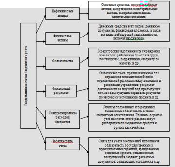 План счетов бюджетного учета состоит из пяти разделов и группы за балансовых счетов: нефинансовые активы, финансовые активы, обязательства, финансовый результат, санкционирование расходов бюджетов, забалансовые счета (рисунок 1).