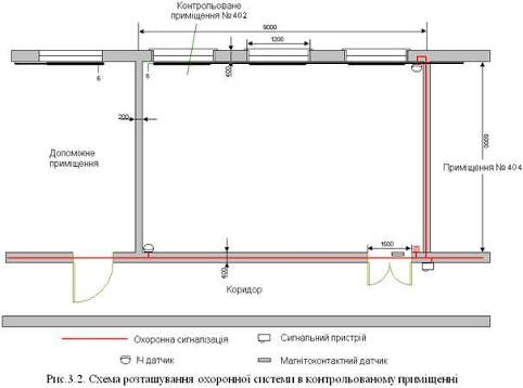 Видiлене примiщення знаходиться на четвертому поверсi будiвлi. План примiщення представлений на рис. 3.1. Розмiри примiщення: висота 3,5 метра, ширина 6 метрiв, довжина 9 метрiв. Примiщення знаходиться в межах контрольованоi зони, вiдстань до межi якоi не менше 40 метрiв. Примiщення маi одне вiкно, яке виходить на внутрiшню частину територii. Дверi виходять в коридор, в якому можуть знаходитися як працiвники самоi органiзацii, так i стороннi люди.