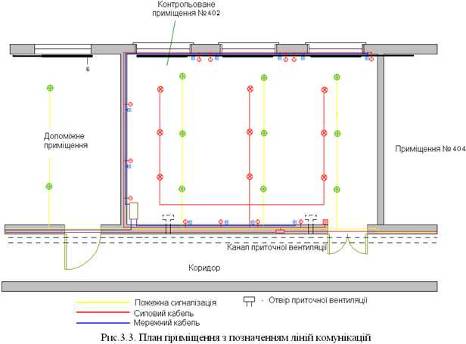 Схема примiщення з зазначенням систем комунiкацii (система електрифiкацii, локальна мережа, кабелi i датчики пожежноi сигналiзацii) наведена на рис. 2.3.