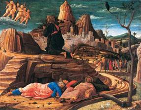 "Моление о чаше" Андреа Мантеньи обильно символами. Коленопреклонённый Спаситель молится на скале, которая символизирует мужество, силу, твёрдость в вере. Ведь, несмотря на проявление минутной слабости, Христос сказал Богу Отцу: "Не Моя воля, но Твоя да будет". С неба Ему являются ангелы. Один из них держит крест, как знак того, что именно на кресте будет распят Спаситель. В руках другого ангела тАФ копьё, указывающее на то, что копьём будет пронзен распятый Христос. У третьего ангела тАФ колонна, символ Страстей Господних. По скале от молящегося Богочеловека убегают кролики тАФ символ робости и плотских похотей. Это означает, что в двойственной природе Христа (Бога и человека) побеждает духовное, Божеское начало. У подножия крепко спят трое Его любимых учеников. Сон тАФ символ духовной смерти. Возле них три что-то грызущих кролика. Это указывает, что в учениках ещё много человеческих слабостей, которыми и объясняется их сон. На высоком полусухом дереве сидит пеликан тАФ символ Бога Отца и жертвенной смерти Христа. Внизу, возле спящих учеников, мы видим птенцов пеликана. Согласно преданию, пеликан вскармливал своих мёртвых птенцов кровью, после чего они воскресали, а сам он умирал. Эта аллегория указывает на добровольную жертву Христа ради спасения человечества, ради нравственного воскресения людей. Поэтому Данте называл Его тАФ nostro Pellicano (наш Пеликан). Скала, на которой находятся Христос и его ученики, отделена от остального мира руслом ручья, через который перекинут мосток. Мост, соединяющий два берега, символизирует переход из одного мира в другой: от мира смертных и смерти к миру вечной жизни, бессмертия. На бесплодной скале рядом с учениками видны ростки новой жизни: растёт молодое деревце и местами пробивается травка сквозь камни. Этим художник выразил мысль, что новое христианское учение уже дало ростки в душах учеников и обещает их преображение в апостолов, проповедников новой веры.