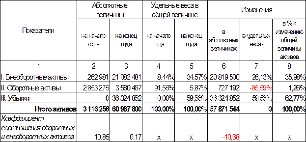 Анализ структуры активов проведем на основе данных табл. 1. В таблице представлены абсолютные величины по видам активов, их удельные веса в общей величине активов, изменения абсолютных величин и удельных весов, значения и изменения коэффициента соотношения оборотных и внеоборотных активов за отчетный период. В графе 8 таблицы отражены доли изменений по каждому виду активов (внеоборотные, оборотные) в изменении общей величины активов предприятия. В ходе анализа информации поданной графе выясняется вид имущества, на увеличение которого в наибольшей мере был направлен прирост источников средств организации.