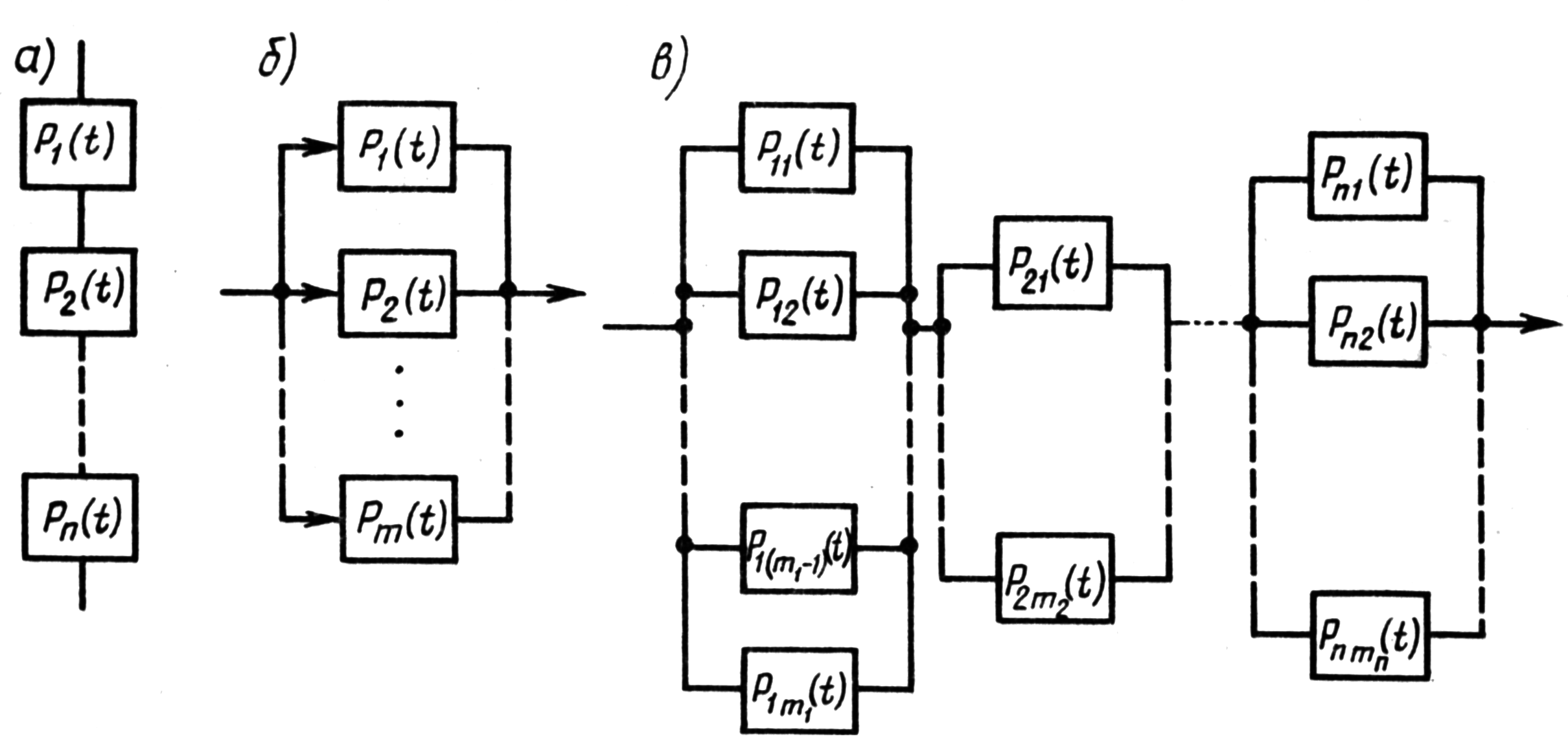 При построении надежностных структурных схем используют последовательное, параллельное и последовательно-параллельное включение элементов.