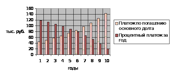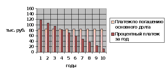 Выводы: При дифференцированных платежах кредит погашается равными долями в течение всего срока погашения. Самые трудные для заемщика годы – первые годы, а самый крупный платеж по кредиту – первый платеж. Зато остаток задолженности и процентные платежи все время снижаются. В упрощенном виде погашение кредита при такой схеме выглядит следующим образом.