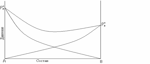 Рис. 8.5. Зависимость общего и парциальных давлений пара от состава: