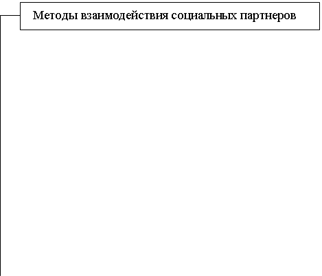 Рис. 1. Методы взаимодействие социальных партнеров Система социального партнерства включает в себя следующие основные элементы: · совокупность постоянно и временно действующих двух-, трехсторонних органов, формируемых представителями работников, работодателей, исполнительной власти и осуществляющих взаимодействие между ними на различных уровнях регулирования социально-трудовых и связанных с ними отношений (Федерация, регионы, отрасли, территории, предприятия); · совокупность различных совместных документов (коллективных договоров, соглашений, решений и др.), принимаемых этими органами на основе взаимных консультаций, переговоров между сторонами, направленных на регулирование социально-трудовых отношений; · соответствующий порядок, формы взаимодействия, соотношения и последовательность в разработке, сроках принятия, приоритетности указанных органов и документов. Важнейшими элементами механизма социального партнерства являются: · постоянно действующий переговорный процесс между представителями институтов социального партнерства, т. е. профсоюзов, объединений работодателей, предпринимателей и властных структур; · постоянно работающие органы (трехсторонние комиссии) по регулированию социально-трудовых отношений; · установление и соблюдение процедур согласования интересов и позиций сторон; · кодификация отношений партнерства в законах РФ, субъектов Федерации, в нормативных документах органов государственного управления; · системы контроля за выполнением принятых договоров и соглашений; · работа экспертов партнерских отношений, анализирующих состояние и перспективы развития системы социального партнерства; · доведение идей социального партнерства до широких слоев трудящихся. Основными принципами социального партнерства, закрепленными в ст. 24 ТК, являются: – соблюдение норм законодательства: все стороны и их представители должны соблюдать не только Кодекс, законы, но и другие нормы трудового законодательства; – полномочность представителей сторон: требуется документальное письменное подтверждение, что данное лицо является представителем такой-то стороны с такими-то полномочиями; – равноправие сторон как в инициативе переговоров, их ведении и подписании коллективных договоров и соглашений, так и в контроле за их выполнением; – уважение и учет интересов сторон; – заинтересованность сторон в участии в договорных отношениях; – свобода выбора и обсуждения вопросов, составляющих содержание коллективных договоров и соглашений: содержание коллективных договоров и соглашений определяют сами стороны свободно без всякого внешнего давления на них; запрещается всякое вмешательство, ограничивающее права сторон, особенно работников (ст. 5); – добровольность принятия обязательств: каждая сторона принимает на себя обязательства по коллективному договору или социально-партнерскому соглашению путем консенсуса, уступая друг другу, но добровольно, т.е. одна сторона может и не принять на себя обязательство, какое хочет иметь другая сторона в договоре, соглашении (данный принцип связан с предыдущим, поскольку без свободы не может быть и добровольности сторон); – реальность принимаемых сторонами на себя обязательств: сторона должна брать на себя по договору, соглашению такое обязательство, которое она реа