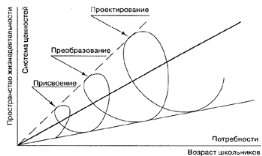 Рис. 1 1-я фаза процесса - присвоение ценностей личностью, формирование Образа Мира. 2-я фаза процесса - преобразование личности на основе ценностей, формирование Образа «Я». 3-я фаза процесса - проектирование - самопроектирование, формирование образа будущего. Предложенная схема процесса ориентации, во-первых, иллюстрирует такую особенность ориентации как наличие объектно-субъектной взаимосвязи личности и общества, опосредованной наличием потребностей личности и ценностями общества. Располагающиеся на горизонтальной плоскости потребности личности могут иметь тенденцию к возвышению на основе их приближения к ценностям, формируя у личности некоторую ценностную «ось сознания» (термин Ядова и Здравомыслова) - ценностные ориентации. Развитие ценностных ориентаций личности на основе присвоения ценностей, их гармонизации с возвышающимися потребностями в свою очередь определяют направленность сознания, самосознания, а, следовательно, и жизненной перспективы, являющейся ценностным вектором развития личности, переведенным в цель жизни, которая завершает личностное самоопределение человека в сфере труда, общения, искусства, познания - в окружающей действительности и самом себе. Во-вторых, предложенная схема позволяет увидеть в процессе ориентации множественность вариантов взаимодействия потребностей и ценностей личности. Подтверждает, что хаотичность стремлений личности сдерживается границей их взаимодействия с ценностями. Ценность в определенной мере стабилизирует потребность или придает ей направление развития. В-третьих, схема дает возможность зафиксировать такую характеристику ориентации как процессуальность. Вбирая фактор времени, обозначая протяженность развития, она определяет и пространственную, и временную линии развития ориентации. В данном случае временная протяженность ориентации согласуется с возрастными изменениями личности школьника. Однако, как мы полагаем, степень с ориентированности человека в окружающей действительности, в познании самого себя в будущем не зависит целиком от возраста человека. Наличие ориентации на социально значимые ценности характеризует личностную зрелость, самостоятельность, которая может не состояться не только в школьные годы, но и позднее. Мы считаем, что определяющим в данном случае является взаимодействие потребностей и ценностей, причем, чем меньше поднимаются они по вертикальной линии, тем в меньшей мере зависят от ценностей, тем менее продолжительна перспектива. Вместе с тем, вбирая фактор времени, определяем протяженность развития личности. В-четвертых, на схеме раскрывается такая особенность процесса ориентации, как расширение пространства жизнедеятельности, а, следовательно, более широкий диапазон взаимодействия потребностей и ценностей, что подразумевает и расширение диапазона, свободы поиска выбора, оценки, проекции - всех механизмов ориентации. В-пятых, отражая динамику ориентации, схема позволяет увидеть, что возвышение потребностей личности к ценностям идет не линейно, по прямой, а спиралеобразно - имеет спады, повороты, возвышения. В-шестых, схема дает визуальное представление о фазах, присущих каждому витку спирали (этапу ориентации): фазы присвоения, преобразования и проектирования, а в целом - постепенного восхождения личности к ценностя