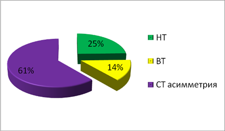 Рис. 9. Типы графиков теппинг-теста (Северный Кавказ, до и после занятия) У 36% студентов скорость выполнения теппинг-теста соответствовала возрастной норме, однако график был неравномерным или нисходящим, что свидетельствует о быстрой утомляемости или слабой нервной системе. После учебной нагрузки показатели теппинг-теста скорость выполнения задания стала ниже у студентов с неравномерным и нисходящим графиком, что указывает на накопление утомления в процессе выполнения умственной работы. Высокая утомляемость нервной системы говорит о возможности срыва механизмов адаптации. У студентов с равномерным и восходящим графиком теппинг-теста скорость выполнения задания осталась практически без изменений. Мы полагаем, что адаптация нервной системы за счет механизмов торможения будет протекать медленнее, но снижает риск срыва адаптации. Низкие показатели теппинг-теста у студентов 2 группы дают основание полагать, что адаптация нервной системы к условиям обучения в РостГМУ у этих студентов проходит за счет охранительного торможения, которое защищает нервную систему от перегрузок. Установленное нами преобладание амбидекстров у представителей 2 группы и преимущественная левополушарность у студентов 1 группы также может быть одной из причин различий течения адаптации к учебной деятельности в Вузе у обследуемых студентов. Кроме того, мы допускаем, что характер адаптации студентов к обучению в ВУЗе в определённой мере связан с латерализацией мозга. Проведённое нами исследование показало, что 62% студентов из Ростовской области имеют левополушарную симметрию, 14% – правополушарную симметрию, и 24% – амбидекстрию (рис. 10). У студентов второй группы левополушарность и амбидекстрия представлены в равной мере. Кроме того, больше число студентов, имеюших слабо выраженную левополушарность, это значит, что детальное восприятие и анализ информации затруднено. (рис. 11)