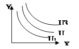 X, Y – обсяги споживання відповідних товарів; U, U1 , U2 , U3 , - криві байдужості. Ринковий кошик (споживчий кошик) — це комбінація товарів для споживання їх протягом певного часу. Споживач не розрізняє набори товарів Xі Y, які розташовані накривій байдужості U. Рівень корисності кожного з наборів на кривій байдужості однаковий. Тому можна вважати, що і крива байдужості показує альтернативні набори товарів, які забезпечують однаковий рівень корисності. Карта кривих байдужості — це засіб відображення переваг споживача, що відповідають різному рівню задоволення його потреб (рис. 2). Карта кривих байдужості складається з безлічі ліній, що не перетинаються. Властивості кривих байдужості1 : 1. Криві байдужості є монотонно спадними функціями (при збільшенні кількості певного блага значення функції спадає). Зафіксуємо набір (Y,X) пари благ 1 та 2 і розглянемо в якій частині площини можуть перебувати еквівалентні набори. Іншими словами нас цікавлять набори, які перебувають на тій самі поверхні байдужості, що (Y,X) рис.3.
