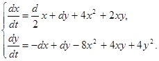 Отже, установлена наступна теорема: Теорема 1.1 Система (1.1) має приватний інтеграл (1.3), коефіцієнти якого виражаються формулами (1.9) - (1.11), за умови, що коефіцієнти системи зв'язані співвідношенням (1.12) і c1= 0, c2= 4b1, a1 (0, 2b1a-a1b (0. 1.2 Побудова квадратичної двовимірної стаціонарної системи із приватним інтегралом у вигляді окружності або гіперболиНехай тепер система (1.1) поряд з інтегралом (1.3) має інтеграл у вигляді: y2+ (x2+ (x+ (y+ (=0 (1.13) Будемо розглядати тепер систему: