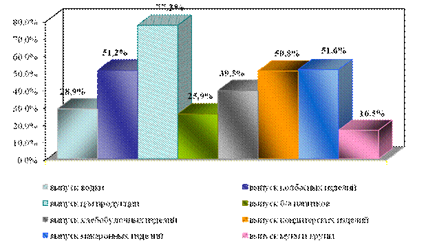 Пищевая промышленность в большей степени, чем другие отрасли, страдает от последствий либерализации цен. На себестоимость производимых продовольственных товаров тяжелым бременем легло резкое удорожание не только собственных издержек производства, но и сырья, высокие ставки за кредиты, которые должны брать предприятия для своего существования. Это повлекло за собой резкое увеличение стоимости производимой продукции, что наряду со значительным снижением покупательской способности населения и наполнением рынков сбыта более дешевой продукцией, поставляемой по импорту и из других регионов страны, привело к значительному спаду объемов производства. По сравнению с уровнем 2003 г. производство пищевой продукции в крае уменьшилось вдвое. За 2009 г. в сравнении с 2003 г. объемы переработки мяса на предприятиях снизились в 6,5 раза, уменьшился выпуск колбасных изделий в 2 раза, цельномолочной продукции – в 4 раза, маргариновой продукции – в 11 раз, масла растительного – 3 раза, кондитерских изделий – в 7 раз. Крайне неудовлетворительно работают предприятия по производству хлебопродуктов. В 2010 г. ими выработано меньше, чем в 2003 г. крупы в 26 раз, муки – в 4,6 раз, макаронных изделий – в 2,4 раза. Производственные мощности пищевых предприятий используются менее чем на 30-40%. В 2008 г. коэффициент использования среднегодовой мощности по производству хлеба и хлебобулочных изделий составил 30%, макаронных изделий – 28%, муки – 25%, масла растительного – 20%, безалкогольных напитков и кондитерских изделий – 15%, маргариновой продукции – 6%, крупы и виноградных вин – 3%, шампанских вин – 2%. На рисунке 2.2 показано использование производственных мощностей предприятиями пищевой промышленности.