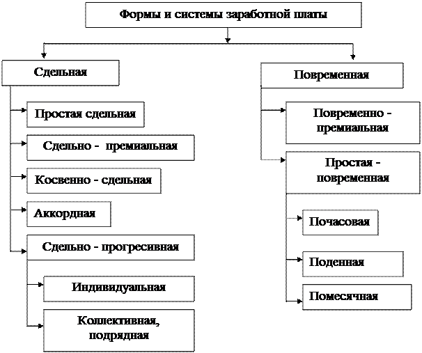 Схема.1. Формы и системы оплаты труда. 2.1. ПОВРЕМЕННАЯ (ТАРИФНАЯ) ФОРМА ОПЛАТЫ ТРУДА При повременной форме оплаты труда работникам оплачивается то время, которое они фактически отработали. При этом труд работников может оплачиваться по часовым тарифным ставкам, по дневным тарифным ставкам, исходя из установленного оклада и фактически отработанного времени. Размеры часовых (дневных) тарифных ставок и окладов для различных работников организации устанавливаются в Положения об оплате труда и указываются в штатном расписании. Штатное расписание составляется по форме № Т-3, утвержденной постановлением Госкомстата России от 06.04.2001 № 26, и утверждается приказом руководителя организации. Для определения количества времени, которое фактически отработано работниками организации, необходимо вести табель учета использования рабочего времени. В табеле отмечаются фактически отработанные часы и дни, указываются причины неявок на работу и т. д. Табель заполняется по форме № Т-12 (если учет рабочего времени ведется вручную) или по форме № Т-13 (если учет рабочего времени ведется на компьютере). 2.1.1. Простая повременная оплата труда При простой повременной системе оплаты труд работников оплачивается за фактически отработанное время. Причем, в табеле учета рабочего времени отражается как отработанное, так и неотработанное время. Если работнику установлена часовая ставка, то заработная плата начисляется за то количество часов, которое он фактически отработал в конкретном месяце. Сумма заработной платы является произведением часовой ставки и количества отработанных часов в неделю. Пример. Работнику часовая ставка заработной платы установлена в размере 30 руб./ч. За октябрь 2007 г. он отработал 168 часов (21 рабочий день по 8 часов-). Заработная плата работника за октябрь 2007 г. составит: 30 руб./ч х 168 ч = 5 040 руб. Если работнику установлена дневная ставка, то заработная плата начисляется за то количество дней, которое он фактически отработал в конкретном месяце. Пример. Работнику установлена дневная ставка заработной платы 250 руб./дн. В ноябре 2007 г. он отработал 20 дней. Заработная плата работника за ноябрь 2007 г. составит: 250 руб./дн. х 20 дн. = 5 000 руб. Работнику может быть установлен месячный оклад. Если все дни в месяце отработаны работником полностью, размер его заработной платы не зависит от количества рабочих часов или дней в конкретном месяце. Оклад начисляется в полном размере. Пример. Работнику установлен месячный оклад в размере 6 000 руб. За октябрь 2007 г. он отработал все дни полностью (21 рабочий день). Заработная плата работника за октябрь 2007 года составит 6 000 руб. Если работник отработал не весь месяц, то заработная плата начисляется только за те дни, которые фактически отработаны. Заработная плата работника определяется следующим образом: Пример. За ноябрь 2007 г. работник из 20 рабочих дней проработал 15 дней (5 дней работник находился в отпуске без сохранения заработной платы). Заработная плата работника за ноябрь 2007 г. составит: 6 000руб.: 20 дн. х 15 дн. = 4 500 руб. 2.1.2. Повременно-премиальная оплата труда При повременно-премиальной оплате труда вместе с заработной платой могут начисляться премии. Премия является одной из важнейших форм материального стимулирования. Премии могут устанавливаться как в твердых суммах, так и в процентах от тарифной ставки (оклад