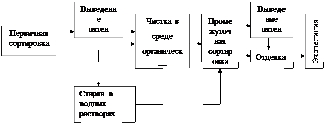 1.2.2 Участок выведения пятен Удаление пятен может производится с помощью пятновыводного станка или вручную. Последовательность удаления пятен. Удаление пятен производится как перед общей мойкой изделий, так и после нее. Предварительное удаление пятен производится в том случае, если пятна в процессе мойки могут закрепится и стать трудноудаляемыми. Закрепление пятен происходит в стадии сушки, когда изделия для освобождения от растворителя обрабатываются воздухом, нагретым до 60-800 С. В этих условиях некоторые вещества начинают диффундировать внутрь волокон, насыщенные кислоты превращаются в высокомолекулярные соединения, многие вещества вступают в химическое взаимодействие с волокнистым материалами. В других случаях удаление пятен необходимо потому, что вещества, образующие пятна, могут вызвать порчу изделий, обрабатываемых совместно. Пятна масляной краски, затвердевшие на изделиях, могут вызвать разрушение тонких шелковых тканей. Перед общей мойкой удаляют с изделий пятна крови, чернил, красителей, губной помады; а также пятна от вина, фруктовых и ягодных соков, травы, ржавчины, туши, пятна от лаков, белковых веществ (молока, мороженого, яиц), растительного масла, рыбьего жира, косметических и лекарственных препаратов. Застаревшие пятна перед мойкой подвергаются размягчению с помощью олеиновой кислоты, растворов ПАВ. При удалении пятен сначала обрабатывают белковые пятна, так как ферменты действуют 30 – 40 мин, затем удаляют легкоудаляемые пятна и под конец оставляют трудноудаляемые. Механизм удаления пятен. Способ удаления пятен зависит от состава загрязнений, образовавших пятно. Возможны растворение, солюбилизация, эмульгирование, диспергирование, химические и биологическое воздействия. Растворение загрязнений происходит при удалении пятен нефтяных масел и жиров при помощи бензина. Солюбилюзирующее действие, или коллоидноя растворимость, имеет место при удалении пятен пота органическими растворителями. В которых соли не растворимы. Эмульгирующее действие на пятна оказывают водные растворы ПАВ, которые окружают частицы жира оболочкой из молекул ПАВ, уменьшают силу сцепления жира с поверхностью волокон и переводят их в эмульсии. Химическое воздействие основано на переводе загрязнений в растворимую форму или бесцветное соединение, не воспринимаемые на ткани как пятно. Биохимическое воздействие имеет место при удалении с помощью ферментов пятен. В состав которых входят белковые вещества. Для определения количества изделий, поступающих на участок выведения пятен, необходимо объём услуг полученный в пункте 1.2.1 из килограммов перевести в штуки. Исходными данными для расчета являются ассортимент обрабатываемых изделий, удельный вес в каждой ассортиментной группы в общем объёме работ, средняя масса конкретного вида ассортимента (табл.1.2.2.1). Таблица 1.2.2.1 Количество изделий в килограммах и штуках в разрезе ассортиментных групп