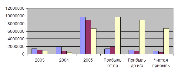 Примечание. Собственная разработка автора В результате анализа финансового состояния предприятия за 3 года были получены следующие данные: на 21,7% увеличилось имущество предприятия к концу 2005 года по сравнению с 2004 годом (25185 тыс. руб.). Это связано с ростом оборотных и внеоборотных активов на 24666 тыс. руб. и 519 тыс. руб. соответственно. То есть произошло увеличение источников финансирования в 2004 году на 21,7% (25185 тыс. руб.), что вызвано увеличением заемного капитала. Рост оборотных активов произошел в результате увеличения стоимости всех его составляющих: с 54,0% в 1999 году, до 59,34% в 2004 году и 66,22% - 2005 году. Необходимо также отметит рост медленно реализуемых активов на 20235 тыс. руб., что связано с ростом цен на сырьё, материалы и запчасти. Дебиторская задолженность предприятия увеличилась на 2029 тыс. руб., что является хоть и не значительном, но все же негативным фактором в деятельности СООО «Автоевроэкспресс», так как это означает, что из оборота предприятия были отвлечены определенные средства. На 78,4% (2402 тыс. руб.) возросла доля высоколиквидных активов предприятия. Также в результате анализа баланса был отмечен рост собственного капитала предприятия в 2004 году на 9,3% (6400 тыс. руб.) и на 12,9% (9703 тыс. руб.) в 2005 году, однако доля собственных средств в источниках финансирования уменьшилась с 64,96% до 60,25%. Собственный капитал предприятия составляет более 50%. На 15482 тыс. руб. вырос заемный капитал предприятия, что вызвано увеличением кредиторской задолженности, что в определенной мере является положительной тенденцией в деятельности СООО «Автоевроэкспресс». Также было отмечено увеличение краткосрочных кредитов и займов на 4522 тыс. руб. Отсутствие долгосрочных обязательств у предприятия уменьшает возможность капитальных вложений, однако огромным преимуществом является достаточное количество собственных источников финансирования у предприятия СООО «Автоевроэкспресс». В 2003 происходило становление организации, налаживание контактов с заказчиками, формирование штата водителей. Из-за отсутствия наработанной базы данных, опыта работы, постоянных заказчиков, грузоперевозки производились через посредничество экспедиционных фирм, которые предлагали низкие ставки фрахта за перевозку. К концу 2003 г. положение выровнялось. Если в 2-ом полугодии была 2003 получена выручка в размере 15,7млн. руб., то за 2-ое полугодие 2005– 49,1 млн. руб., а за 1-ый квартал 2006г. – уже 47,3 млн. руб. Удельный вес международных перевозок в 2003 г. составил 35,7%, за 3 месяца 2005г. – 80% В 2005 году по сравнению с 2004 годом произошло резкое увеличение себестоимости международных перевозок. Это объясняется увеличением удельного веса международных перевозок в общем объеме оказанных услуг с 35,7% до 80%. (Приложение 3) Благодаря получению книжек МДП, расширению рынка сбыта транспортных услуг, увеличению размера оплаты за услуги, темп роста объема реализованных услуг к 2010 в среднем составит ≈ 5%. Соответственно увеличатся отчисления в бюджет. Некоторое увеличение себестоимости оказанных услуг произойдет из-за предполагаемого увеличения штата сотрудников, следовательно возрастут расходы на оплату труда, отчисления от ФОТ, в ФСЗН и взносы в фонд обязательного страхования. Также возрастут расходы на приобретение дизельного топлива, возмещение командировочных расходов водителей автомобилей, осуществляющи