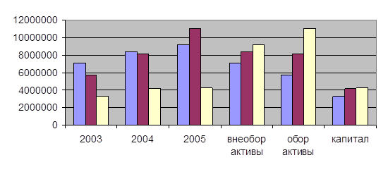 А теперь попробуем отследить куда предприятие распределяет свои финансовые ресурсы, и проследим динамику изменения внеоборотных активов, оборотных активов и капитала : Диаграмма 2.4.
