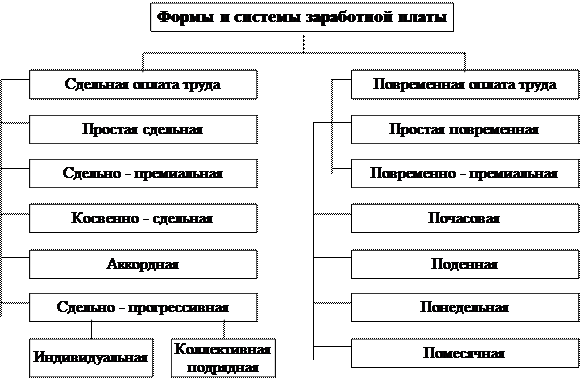 Рис. 1.1. Формы и системы заработной платы Существует ряд условий, при которых целесообразно применять ту или иную форму оплаты труда. Условия применения сдельной оплаты труда: - возможность точного учета объемов выполняемых работ; - наличие количественных показателей работы, непосредственно зависящих от конкретного работника; - возможность технического нормирования труда; - возможность у рабочих конкретного участка увеличить выработку или объем выполняемых работ; - необходимость на конкретном производственном участке стимулировать рабочих в дальнейшем увеличении выработки продукции или объемов выполняемых работ. Сдельную оплату труда не рекомендуется применять в том случае, если ее применение ведет к: - ухудшению качества продукции; - нарушению технологических режимов; - ухудшению обслуживания оборудования; - нарушению требований техники безопасности; - перерасходу сырья и материалов. Условия применения повременной оплаты труда: - отсутствие возможности увеличения выпуска продукции; - производственный процесс строго регламентирован; - функции рабочего сводятся к наблюдению за ходом технологического процесса; - функционирование поточных и конвейерных типов производства со строго заданным ритмом; - рост выпуска продукции может привести к браку или ухудшению ее качества. На каждом конкретном предприятии в зависимости от характера выпускаемой продукции, наличия тех или иных технологических процессов, уровня организации производства и труда применяется та или иная форма оплаты труда. Например, сдельная оплата труда может быть неэффективной, если применять только сдельно – премиальный или сдельно – прогрессивный вариант, но если использовать аккордную систему, то эффективность ее возрастает. На одном и том же предприятии в зависимости от выпуска конкретного вида продукции по цехам варианты применения оплаты труда также могут быть различны. В условиях рынка нет той строгой регламентации, которая была характерна для плановой экономики, поэтому предприниматель, руководство предприятия могут проверить любой из существующих вариантов оплаты труда и применять тот, который в наибольшей степени соответствует целям предприятия. Бестарифная система оплаты труда используется в условиях рыночной экономики, важнейший показатель которой по каждому предприятию является объем реализованной продукции и услуг. Чем больше объем реализованной продукции, тем более эффективно работает данное предприятие, следовательно, и заработная плата корректируется в зависимости от объема производства. Эта система используется для управления персонала вспомогательных рабочих, для работников с повременной оплатой труда. Разновидностью бестарифной системы оплаты труда является контрактная система. При контрактной форме найма работников начисление заработной платы осуществляется в полном соответствии с условиями контракта, в котором оговариваются: условия труда, права и обязанности, режим работы и уровень оплаты труда, конкретное задание, последствия в случае досрочного расторжения договора. Контракт подписывается руководителем предприятия и работником. Он является основой для решения всех трудовых споров. При повременной заработной плате работник получает денежное вознаграждение в зависимости от количества отработанног
