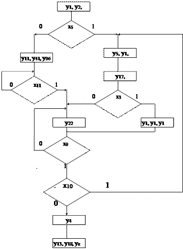 Управления объект, характеризуется следующими параметрами: - множество проверяемых условий - X ={x1 ,x1 , .. x15 .}; - множество выполняемых микроопераций - Y ={y1 ,y2 , .. y120 , yк } (yк - микрооперация , означающая последнюю микрокоманду микропрограммы); - ёмкость памяти для записи микропрограмм - Vзу = 1кбайт = 2*29 байт; - длина ячейки памяти - L = 16 бит; - начальный адрес размещения составляемой микропрограммы в памяти - Ан =421; Исходя из характеристик управляемого объекта, следует: - длина поля для кодирования микроопераций равна к=7 - длина поля для кодирования условий равна р=4 - длина кода адреса равна р=9