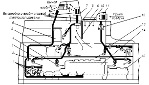 1 - сепараторы топлива н масла; 2 - электровеятилятор центробежный; 3 - заслонка дроссельная; 4 - воздухораспределитель поворотный; 5 - вспомогательный котел; в - утилизационный котел; 7, 11 - воздухоприемное устройство; 8 - электровеятилятор центробежный вертикальный; 9-световой люк; 10 - ширма; 12 - электровентилятор осевой; 13 - подогреватель воздуха; 14- главный двигатель; 15 - вспомогательный дизель-генератор. Рис. 3.4. Принципиальная схема искусственной приточной и естественной вытяжной вентиляции МКО судна с дизельной установкой Вытяжка воздуха осуществляется естественным путем из верхней зоны машинно-котельного отделения, как правило, через кожух дымовой трубы. Если удалить воздух из машинно-котельных отделений естественным путем невозможно, допускается установка в шахте вытяжных электровентиляторов. Удаление воздуха из машинно-котельного отделения через световой люк не допускается. На судах с паротурбинными, газотурбинными установками и с СПГГ рекомендуется применение для выброса отработавших газов эжектирующих устройств в совокупности с организованной вытяжкой воздуха из помещений МКО через кожух дымовой трубы. Эжектирующее устройство в этом случае является наиболее эффективным средством выброса газов от энергетического оборудования, исключающим задымление палуб. Системы вентиляции являются разветвленными судовыми системами, состоящими из разнообразного, в том числе и крупногабаритного, оборудования. Их проектирование тесно связано с планировкой общего расположения судовых помещений, а в ряде случаев влияет на архитектуру судна в целом. Используемые в этих системах электродвигатели для привода вентиляторов и насосов, а также теплообменные аппараты, потребляющие различного рода тепло- и хладоноситель, оказывают существенное влияние на общую энерговооруженность судна. Проектирование систем вентиляции является трудоемким процессом, требующим специальных навыков и достаточно высокой квалификации исполнителей. На основании описанных принципов действия системы кондиционирования, в рамках данного дипломного проекта: 1. выполним размещение датчиков температуры в помещениях судна на уровне 180 см от пола (13 датчиков температуры); 2. установим запорные устройства (исполнительные механизмы) в узловых местах воздухопровода (4 исполнительных механизма); 3. обеспечим непрерывный мониторинг (в реальном времени) состояния датчиков температуры; 4. при несовпадении сигнала с датчика с технологическими параметрами реализуем: 4.1. автоматический и полуавтоматический запуск оросительной подсистемы; 4.2. выдачу сигналов тревоги и индикацию аварийного участка на мнемосхеме оператора. 3.3 Осушительно-балластная подсистема На рисунке 3.5. показана схема систем охлаждения главной машины и перекачки воды внутри судна. Насос 1, предназначенный для охлаждения главной машины 5, расположен ниже уровня жидкости, подлежащей перемещению, поэтому через приемную сетку 3 по всасывающему (приемному) трубопроводу 2 вода поступает к насосу, откуда по нагнетательному трубопроводу 4 — в рубашки цилиндров и далее по отливному трубопроводу вытекает за борт. В приемное отверстие насоса вода поступает под давлением атмосферного воздуха на свободную поверхность воды на уровне грузовой ватерлинии и столба воды, равного глубине погружения приемного 