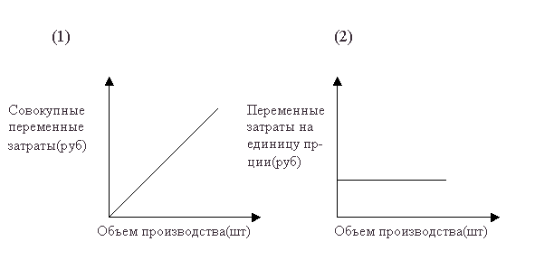Рис. 2. Классификация затрат в зависимости от поставленных целей. 3) Внешние затраты - это денежные расходы на приобретение сырья, средств труда, оплату услуг сторонним поставщикам и подрядчикам и т.п.. Внутренние затраты –это расход ресурсов для осуществления производственно-хозяйственной деятельности. Ресурсы по мере использования переходят в категорию внутренних. 4)Инкрементные - это разность между затратами двух сопоставимых вариантов решений. В одном из вариантов они могут присутствовать, а в другом присутствовать в большей или меньшей сумме. Чаще всего возникновение данных затрат связано с производством дополнительного объема выпуска продукции. 5)Переменные затраты –это затраты, которые имеют пропорциональную зависимость от уровня производственной деятельности (от объемов производства). Совокупные переменные затраты имеют линейную зависимость от объема производства, а переменные затраты на единицу продукции- величина постоянная(рис. 3).