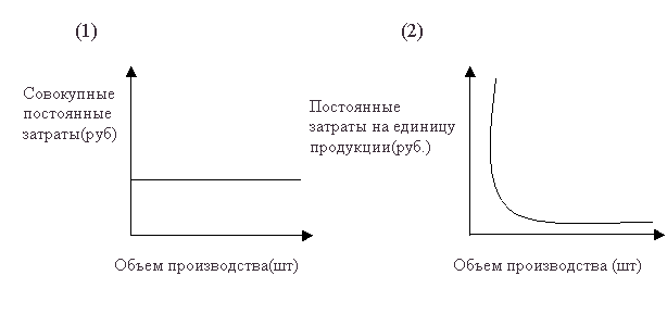 Рис.3. Динамика совокупных (1) и удельных (2)переменных затрат. Постоянные затраты –это элемент затрат или расходов, который не зависит от объема деятельности в краткосрочном периоде. Поведение совокупных постоянных и удельных постоянных затрат нагладно представлено на рис. 4.