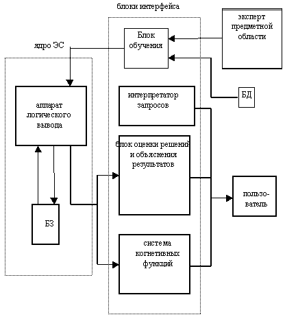 В настоящее время при широком использовании символьного подхода усилилось внимание к использованию нейтронных сетей. Это объясняется тем, что предложены очень мощные модели нейтронных сетей и алгоритмы их обучения (метод обратного распространения ошибок). Нейтронные сети используются в медицинской диагностике, управлении самолетом, налоговых и почтовых службах США. Одной из составляющих успеха нейтронных сетей явилась совместная разработка компании Intel и корпорации Nestor микросхемы с архитектурой нейтронных сетей. Тенденции развития средств вычислительной техники: 1. Развитие вычислительной базы: параллельные, нейтронные и оптические технологии, которые будут способны к распределенному представлению информации, параллельной ее обработки, обучению и самоорганизации. 2. Развитие теоретической основы для информационной обработки основанный на понятии ‘Softlogic’, поддерживающий как логический, так и интуитивный вывод понятий. 3. Разработка для реальных приложений системы когнетивных функций, таких как речь, звуковые эффекты, когнетивная графика и т.п. ЭС как разновидность систем ИИ. 1. Структура ЭС. 2. Определение знаний и базы знаний (БЗ). 3. Определение понятий логического вывода. 4. Организация интерфейса с пользователем в ЭС. 1. Структура ЭС.