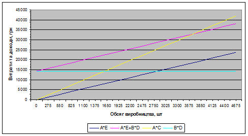 1.а. Визначити обсяг рiчного прибутку F (грн) пiдприємства. Обсяг рiчного прибутку пiдприємства визначається як рiзниця мiж доходом вiд реалiзацiї вироблених виробiв – Аз *С – i сумарними затратами – постiйними та змiнними Аз *Е. Таким чином, F = Аз *С – (Аз *Е + В*D) = 2750*9 – (2750*5,08 + 3*4800) = -3620 (грн) Як бачимо, прибуток виявився вiд'ємним, тобто дане пiдприємство працює зi збитками, i щоб отримати прибуток, треба знизити витрати або пiдняти доход за рахунок пiвищення параметрiв обсягу Аз i/або цiни С. 1.b. Визначити параметри точки беззбитковостi для даного пiдприємства. Для цього побудуємо графiки доходiв i витрат пiдприємства в координатах «Обсяг виробництва» – «Витрати та доходи» на основi розрахункової таблицi 1.2. Таблиця 1.2. Розрахункова таблиця для побудови графiкiв доходiв i витрат