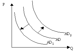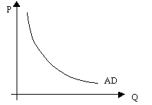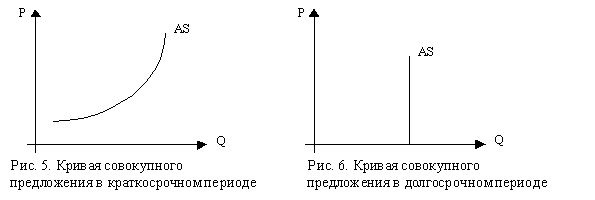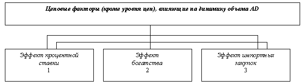 2. Факторы, влияющие на совокупный спрос и совокупное предложение Рис.1 Макроэкономическое равновесие Графической формой выражения совокупного спроса является кривая совокупного спроса (рис. 2), отражающая взаимосвязи между желаемыми или планируемыми расходами в экономике на конечные товары и услуги и уровнем цен на них. Рис. 2. Кривая совокупного спроса Нисходящий характер этой кривой означает, что рост цен приводит к сокращению величины совокупного спроса (размеров потребления, инвестиций, расходов правительства и чистого экспорта). К ценовым факторам (кроме уровня цен), которые влияют на динамику объема AD , относятся: 1) эффект процентной ставки; 2) эффект богатства, или кассовых остатков; 3) эффект импортных закупок (рис. 3). Графически действие ценовых факторов выражается движением вдоль кривой AD [10.194]. 1. Условие: денежная масса постоянна. Цены растут, > спрос на деньги увеличивается > процентная ставка возрастает > величина AD сокращается. 2. При росте (снижении) общего уровня цен реальная стоимость, или покупательная способность, накопленных финансовых активов снижается (увеличивается). Соответственно уменьшается (увеличивается) величина совокупного спроса. 3. Если внутренние цены поднимаются по сравнению с ценами за рубежом, то соотечественники будут покупать больше импортных товаров вместо отечественных, соответственно импорт возрастет, экспорт уменьшится, чистый экспорт уменьшится, величина совокупного спроса уменьшится. Рис. 3. Ценовые факторы совокупного спроса Существуют и неценовые факторы совокупного спроса: изменения в потребительских расходах, инвестиционных расходах, в государственных расходах, расходы на чистый экспорт. Действие неценовых факторов графически выражается в смещении кривой AD влево или вправо (рис. 4). Рис. 4. Изменение совокупного спроса под влиянием неценовых факторов Графическим выражением связи между реально представляемым к продаже объемом национального производства и общим уровнем цен является кривая совокупного предложения AS . Она имеет вид восходящей кривой в краткосрочном периоде (рис. 5) и вертикальной прямой в долгосрочном периоде (рис. 6). Следует принять во внимание дискуссию в экономической науке относительно природы и формы кривой AS. Форма кривой совокупного предложения отражает изменение издержек производства на единицу продукции в условиях, когда меняются объемы национального производства. В современной экономической литературе выделяются три отрезка (рис. 7). Рис. 7. Форма кривой совокупного предложения в кейнсианской макроэкономической концепции Классическая школа признает только вертикальную конфигурацию этой кривой. Сдвиг совокупного спроса в интерпретациях этих школ приводит к различиям в изменениях номинального и реального ВНП в производстве и занятости. Влияние неценовых факторов на динамику совокупного предложения графически иллюстрируется сдвигом кривой AS. К неценовым факторам совокупного предложения относятся: 1) уровень цен на производственные ресурсы (внутренние и импортные); 2) структура рынка; 3) производительность; 4) изменение правовых норм (рис. 8) [1,159].