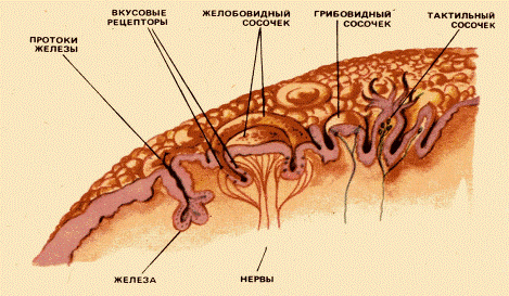 Рисунок 2. Микроскопическое строение языка. Орган вкуса – язык, расположен в начальном отделе пищеварительного тракта и служит для восприятия качества пищи. Рецепторы вкуса представляют собой небольшие нейроэпителиальные образования и носят название вкусовых почек. Они располагаются в многослойном эпителии грибовидных, листовидных и желобоватых сосочков языка и в небольшом количестве – в слизистой оболочке мягкого нёба, надгортанника и задней стенки глотки. Вкусовые луковицы находятся на боковых поверхностях крошечных пупырчатых выростов языка - вкусовых сосочков. Различают несколько типов сосочков. Грибовидные расположены по спинке языка ближе к его краям. 7-8 крупных желобоватых сосочков расположены у корня языка. Нитевидные сосочки, у которых нет луковиц, помогают захватывать пищу при пережевывании. У человека количество вкусовых почек достигает 2000-3000, из них более половины находится в желобовых сосочках.