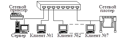 Рис. 1.1 Одноранговая архитектура Одноранговые ЛВС являются наиболее легким и дешевым типом сетей для установки. Они на компьютере требуют, кроме сетевой карты и сетевого носителя, только операционной системы Windows 95 или Windows for Workgroups. При соединении компьютеров, пользователи могут предоставлять ресурсы и информацию в совместное пользование. Одноранговые сети имеют следующие преимущества: - они легки в установке и настройке; - отдельные ПК не зависят от выделенного сервера; - пользователи в состоянии контролировать свои ресурсы; - малая стоимость и легкая эксплуатация; - минимум оборудования и программного обеспечения; - нет необходимости в администраторе; - хорошо подходят для сетей с количеством пользователей, не превышающим десяти. Проблемой одноранговой архитектуры является ситуация, когда компьютеры отключаются от сети. В этих случаях из сети исчезают виды сервиса , которые они предоставляли. Сетевую безопасность одновременно можно применить только к одному ресурсу, и пользователь должен помнить столько паролей, сколько сетевых ресурсов. При получении доступа к разделяемому ресурсу ощущается падение производительности компьютера. Существенным недостатком одноранговых сетей является отсутствие централизованного администрирования. Использование одноранговой архитектуры не исключает применения в той же сети также архитектуры «терминал – главный компьютер» или архитектуры «клиент – сервер». Архитектура клиент – серверАрхитектура клиент – сервер (client-server architecture) – это концепция информационной сети, в которой основная часть ее ресурсов сосредоточена в серверах, обслуживающих своих клиентов (рис. 1.5). Рассматриваемая архитектура определяет два типа компонентов: серверы и клиенты . Сервер - это объект, предоставляющий сервис другим объектам сети по их запросам. Сервис – это процесс обслуживания клиентов.