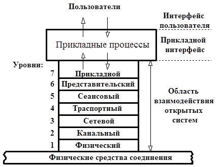 Рис. 2.1 Модель OSI Модель OSI описывает только системные средства взаимодействия, не касаясь приложений конечных пользователей. Приложения реализуют свои собственные протоколы взаимодействия, обращаясь к системным средствам. Если приложение может взять на себя функции некоторых верхних уровней модели OSI, то для обмена данными оно обращается напрямую к системным средствам, выполняющим функции оставшихся нижних уровней модели OSI. Тема 1. Взаимодействие уровней модели OSI Модель OSI можно разделить на две различных модели, как показано на рис.2.2: - горизонтальную модель на базе протоколов, обеспечивающую механизм взаимодействия программ и процессов на различных машинах; - вертикальную модель на основе услуг, обеспечиваемых соседними уровнями друг другу на одной машине.