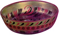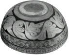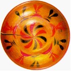 Рисунки на чашах и блюдах основаны на тонком понимании приемов композиции орнамента в круге. Расписывая чашки и блюда, мастера четко выделяли их дно, помещая на нем розетку с линиями, расходящимися от центра подобно солнечным лучам. На более крупных вещах вокруг розетки рисовали квадрат или ромб с мягко закругленными углами, который называли пряником, благодаря его сходству с настоящим узорным пряником, положенным в чашку. Вокруг центра чашки исполняли узор, связанный с движением кисти по кругу. Самый простой рисунок при этом состоял из вертикальных или наклонных красных и черных мазков. Усложняя его, мастера помещали рядом по два или по три красных и черных удлиненных мазка, соединяя внизу их концы. Получался мотив так называемой "лапки", напоминающий птичий след на снегу.